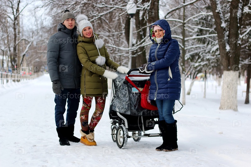 Друзья с коляской в зимнем парке