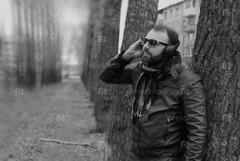 Мужчина в парке в наушниках