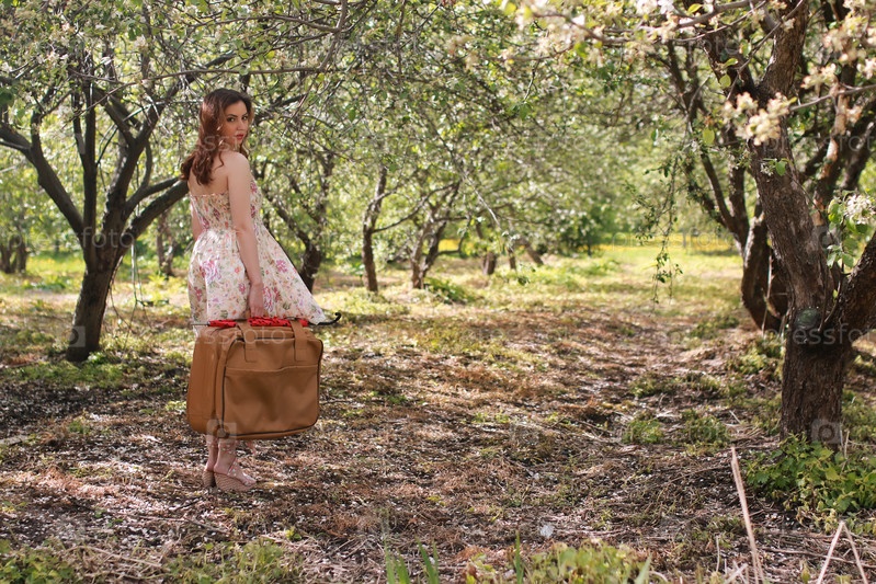 Девушка с чемоданом в лесу