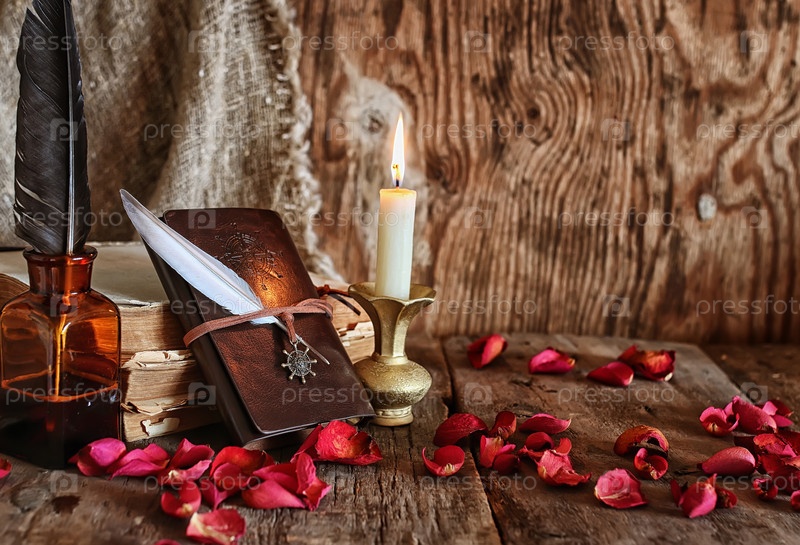 Перо и книжный роман рядом со свечой