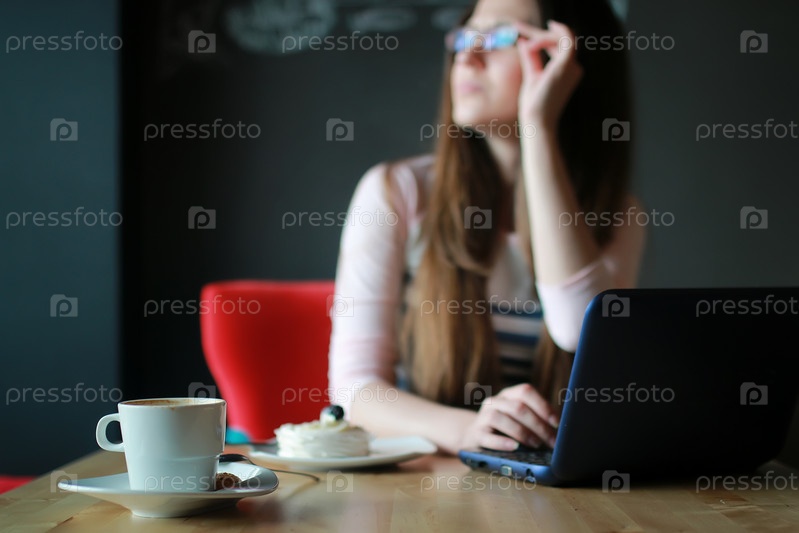 Девушка в кафе с ноутбуком
