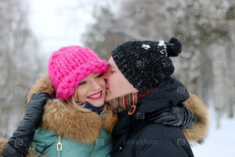 Счастливая пара в зимнем парке