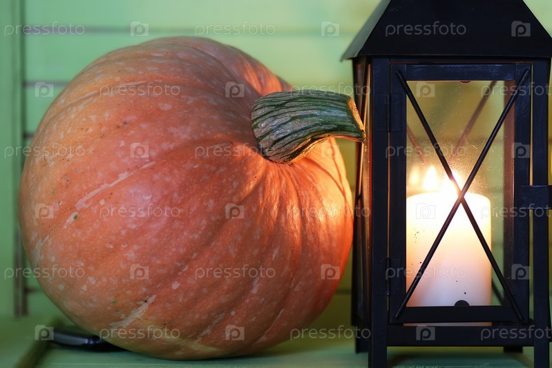 Тыква и лампа на деревянном столе