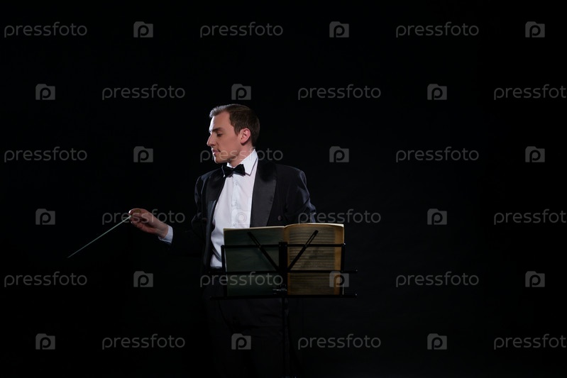 Дирижер оркестра в черном смокинге в темной студии