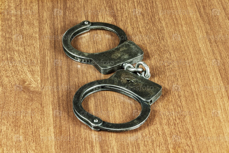 На деревянном столе лежат металлические наручники