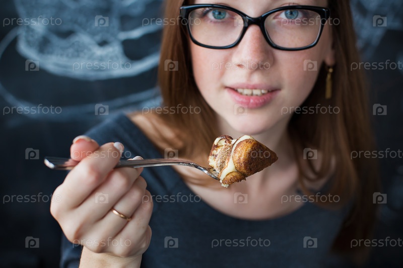 Девушка ест торт вилкой