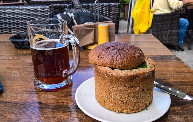 Суп в хлебной чаше и кружка пива, Рига, Латвия