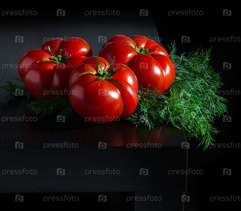 Сочные помидоры с укропом на деревянном темном фоне