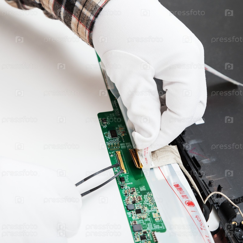 Мастер в белых перчатках заменяет ЖК-экран