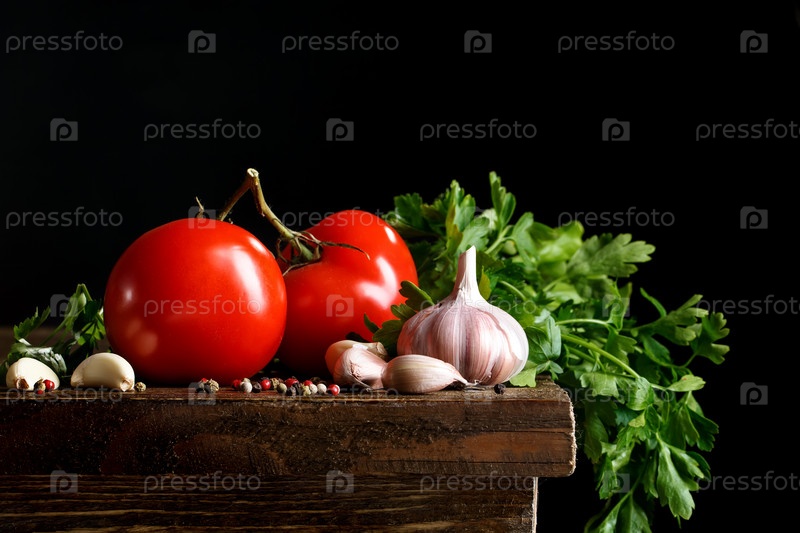 Натюрморт из помидоров, чеснока и петрушки на деревянных досках