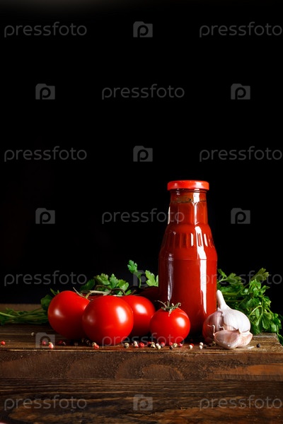 Натюрморт из помидоров, чеснока и петрушки на деревянных досках