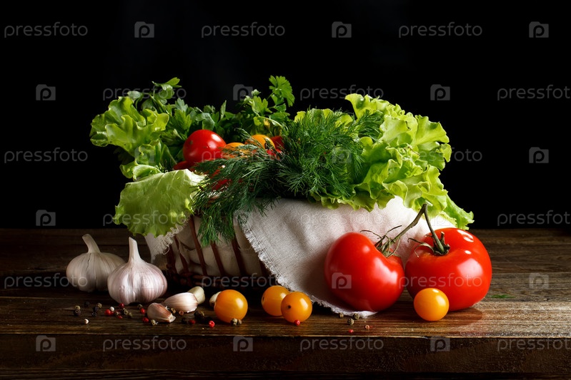 Натюрморт из помидоров, чеснока и петрушки на деревянных досках