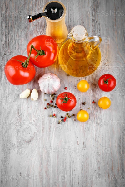 Натюрморт с томатами, чесноком и оливковым маслом
