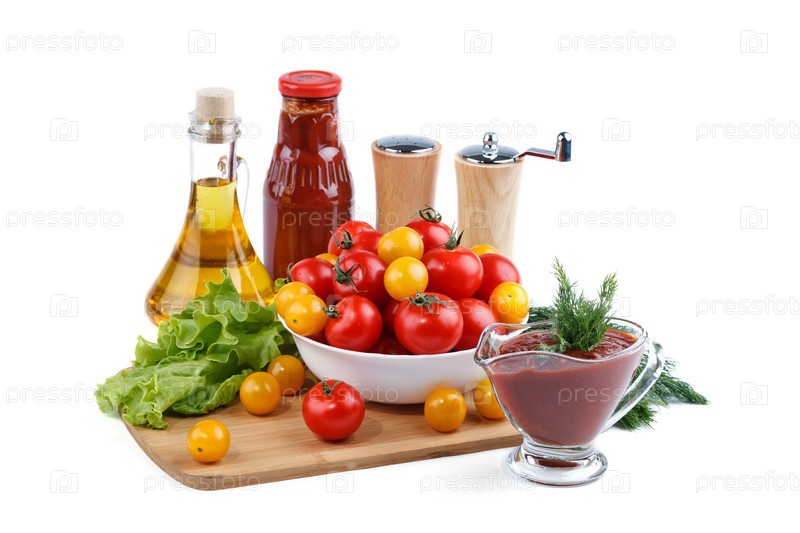 Натюрморт из красных и желтых томатов, бутылка томатного соуса и оливкового масла на белом фоне