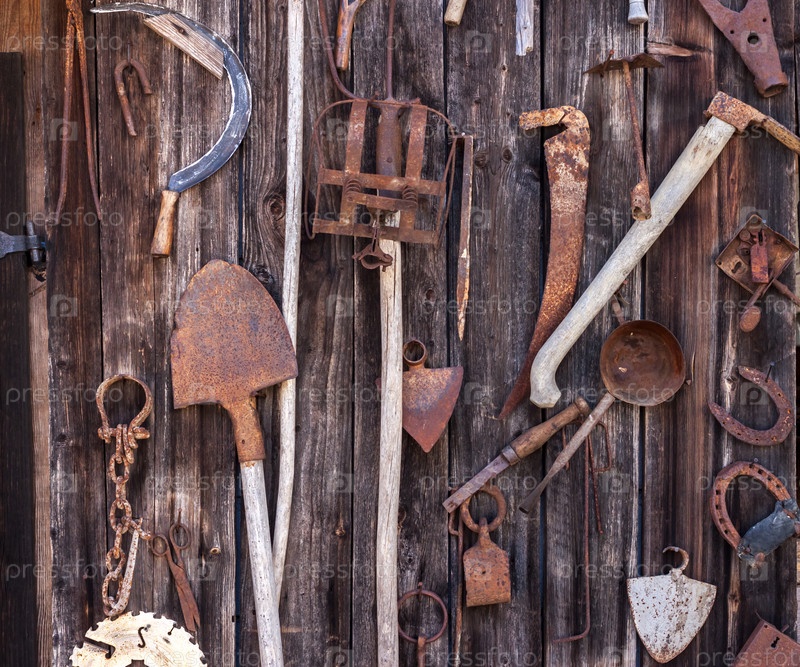Сельскохозяйственные инструменты, висящие на коричневой деревянной стене