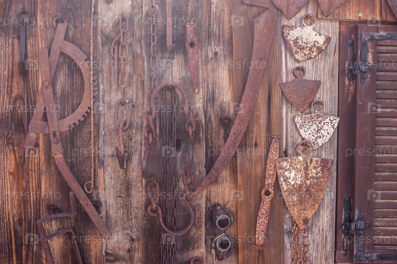 Сельскохозяйственные инструменты, висящие на коричневой деревянной стене
