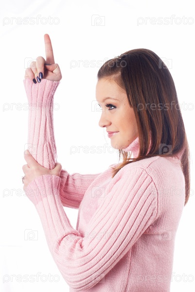 Молодая красивая женщина со сложенной в форме пистолета рукой
