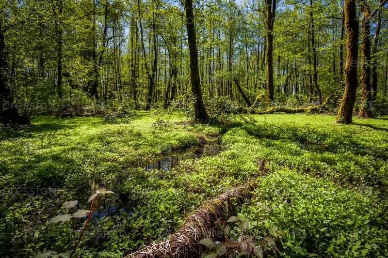 Красивый зеленый пейзаж весеннего леса, влажный солнечный день