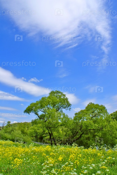 Весенний пейзаж с голубым облачным небом, зеленой травой, цветами и деревьями