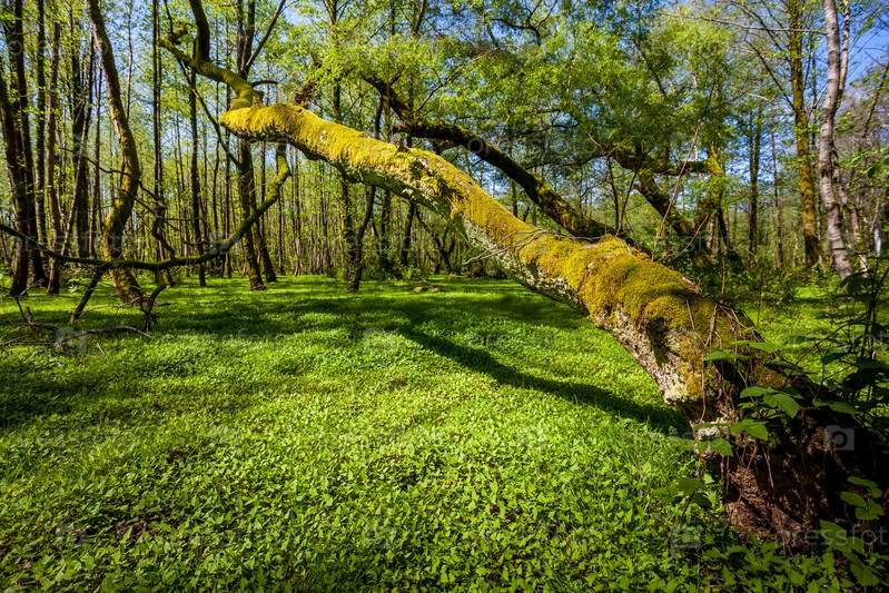 Красивый зеленый пейзаж весеннего леса, влажный солнечный день