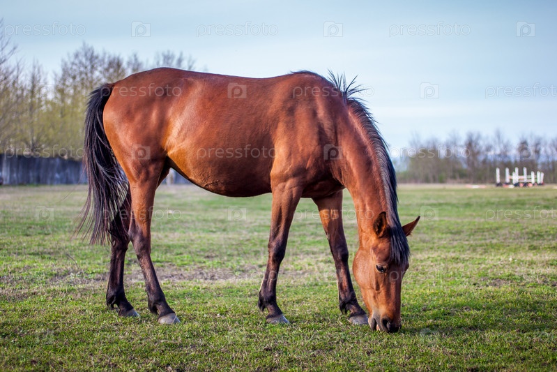Коричневая лошадь на лугу