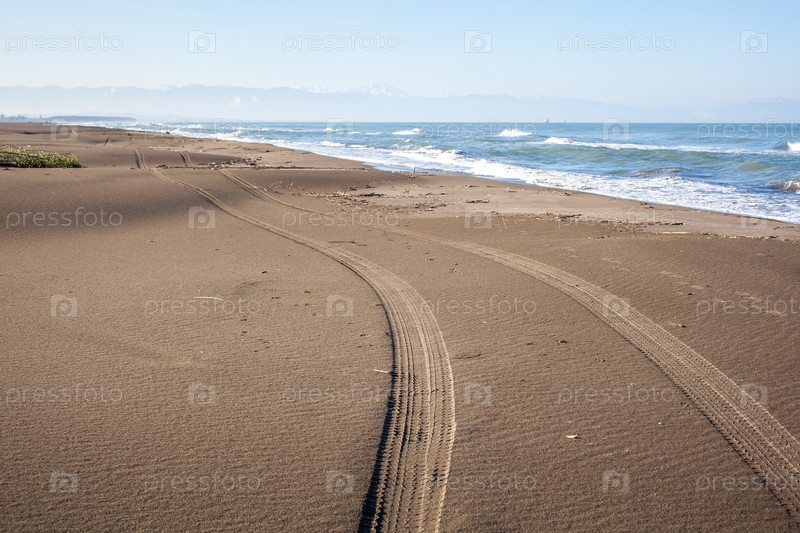 Следы шин на песчаном пляже, Поти, Грузия