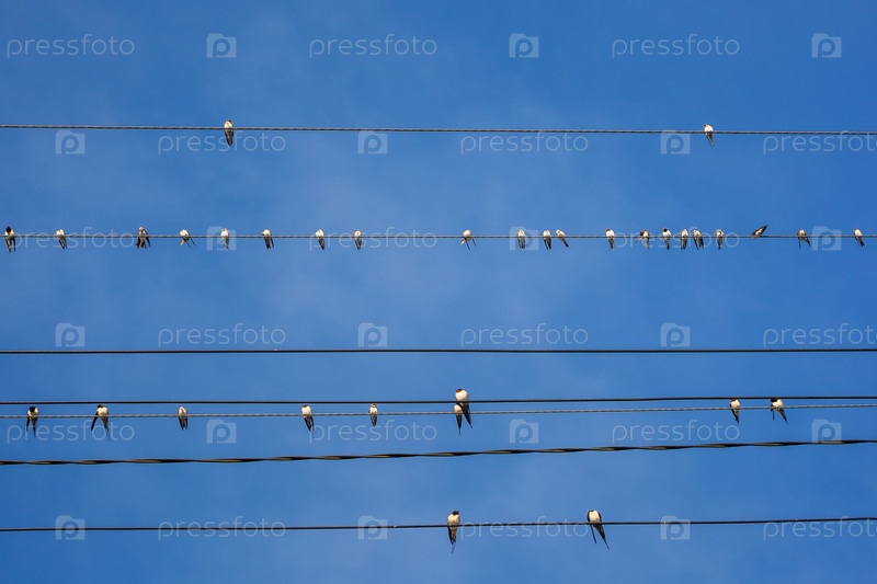 Группа ласточек, сидящих на электрических проводах