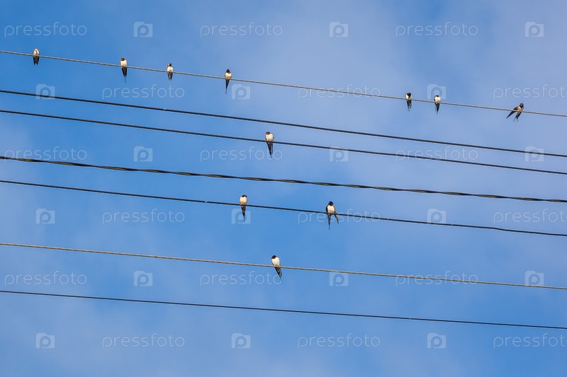 Группа ласточек, сидящих на электрических проводах