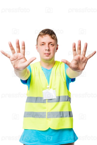 Человек в жилете показывает руки с жестом СТОП