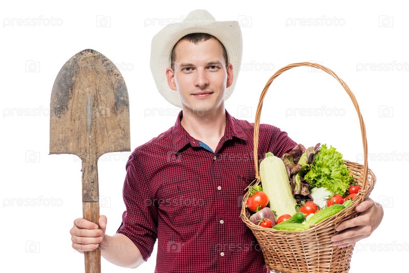 30-летний садовник с корзиной с овощами и лопатой