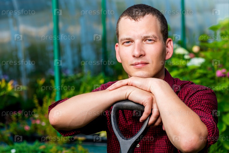 Портрет человека с лопатой в теплице