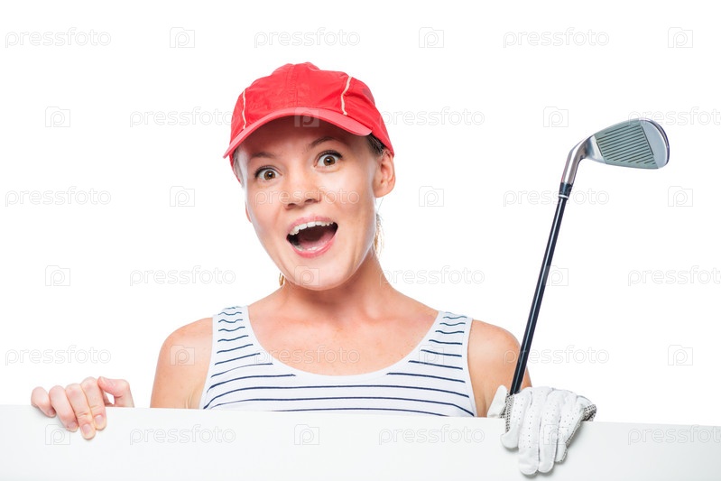 Эмоциональная спортсменка гольфистка с пустым плакатом