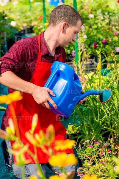 Садовник, поливающий растения из лейки