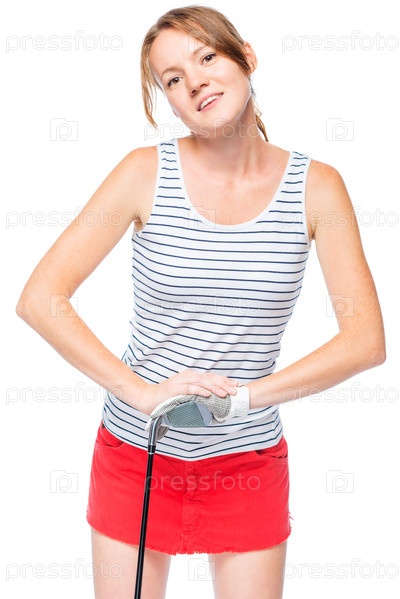 Женщина в перчатке опирается на гольф-клюшку на белом фоне