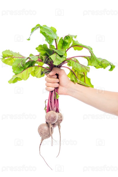 Букет зрелой свеклы в руке на белом фоне