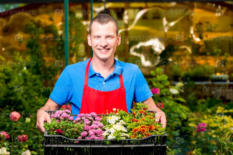 Счастливый бизнесмен, с рассадой цветов для продажи