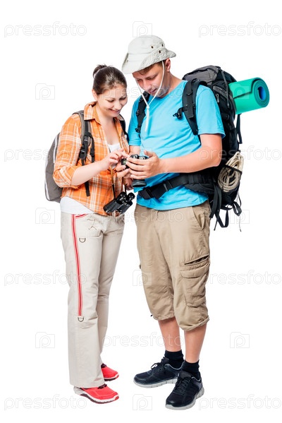 Пара туристов, глядя на свои фотографии на камере на белом фоне