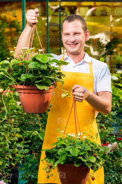 Успешный садовник с клубникой в теплице