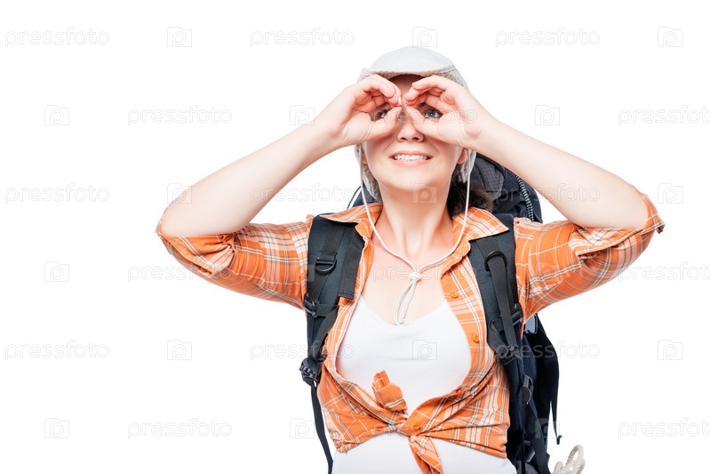Девушка держит руки, как бинокль