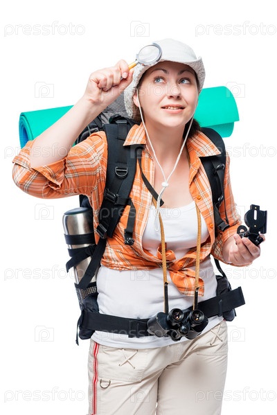 Портрет женщины-исследователя с рюкзаком и лупой на белом фоне