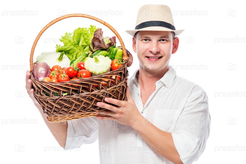 Счастливый фермер с урожаем овощей в корзине на белом фоне
