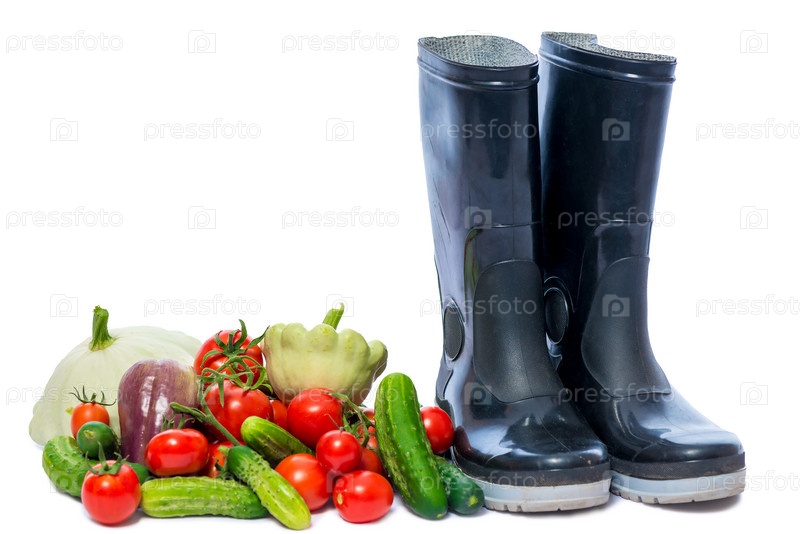 Объекты на белом фоне - резиновые сапоги и куча спелых овощей