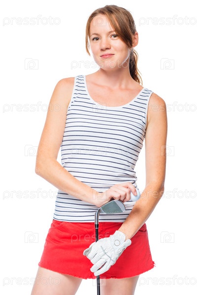 Девушка в полосатой футболке позирует с гольф-клюшкой на белом фоне