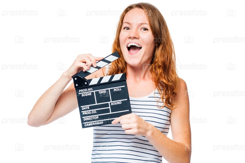 Радостная девушка на белом фоне с киноклаппером