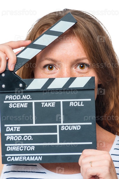 Радостная девушка на белом фоне с киноклаппером