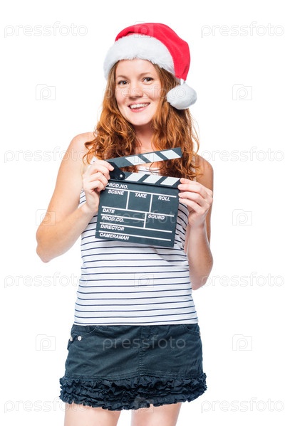 Радостная девушка в шляпе Санты с киноклаппером на белом фоне