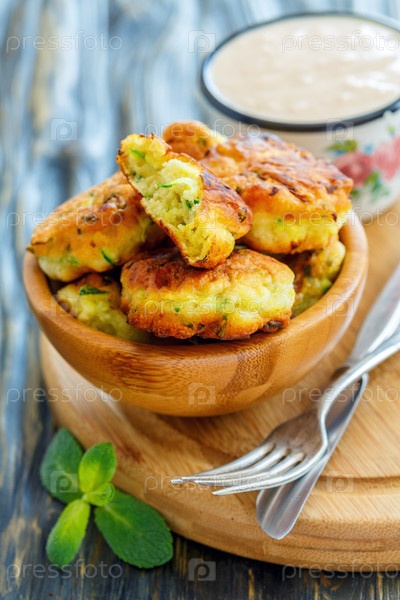 Жареные оладьи из цуккини в деревянной миске