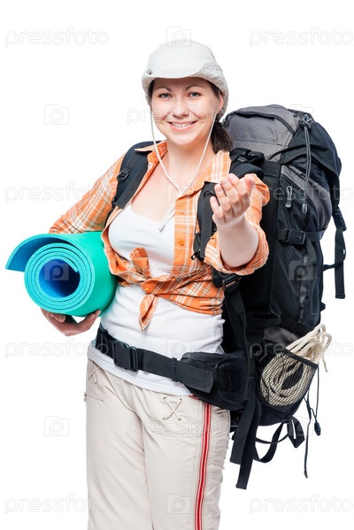 Девушка с туристическим оборудованием приглашает вас пойти с ней походы
