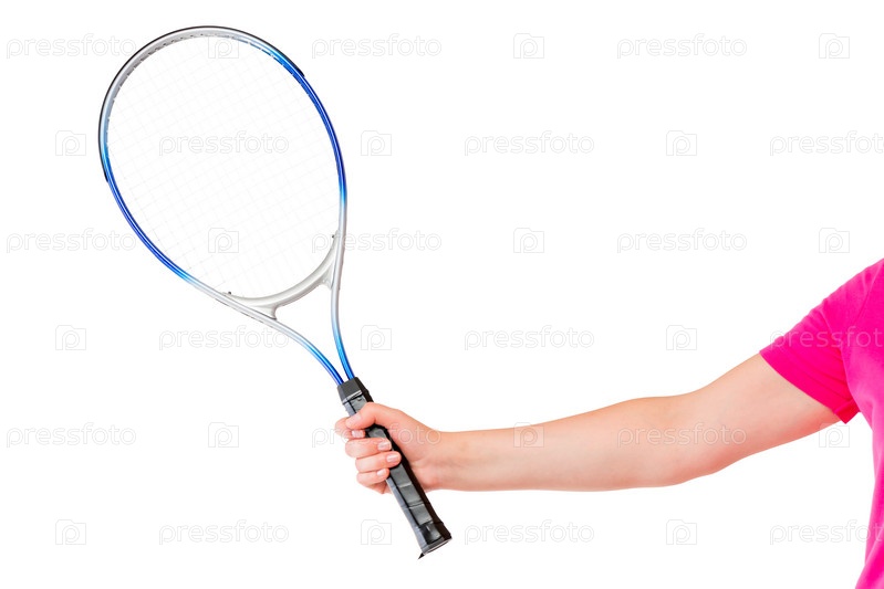 Рука женщины с теннисной ракеткой на белом фоне