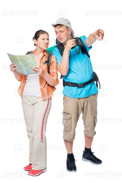 Заблудившаяся пару туристов с рюкзаками на белом фоне